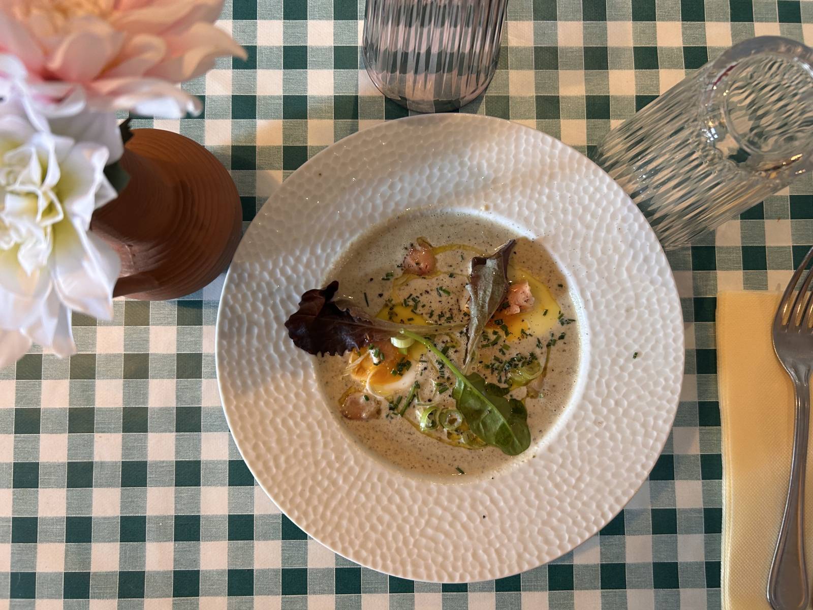 Velouté de champignons à la truffe, oeuf mollet, foie gras, croûtons et herbes fraîches